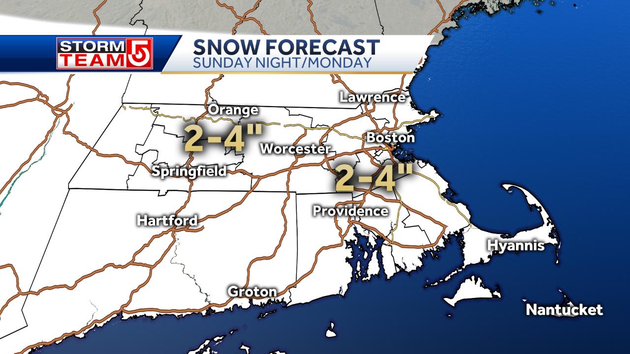 MONDAY (PRESIDENTS DAY): Cloudy start with light snow ending west to east by midday after accumulating a coating to 1 inch along the South Coast except up to 2 inches on Nantucket and a dusting to a coating everywhere else. Clearing afternoon. Highs 33-40. Wind NW up to 10 MPH.